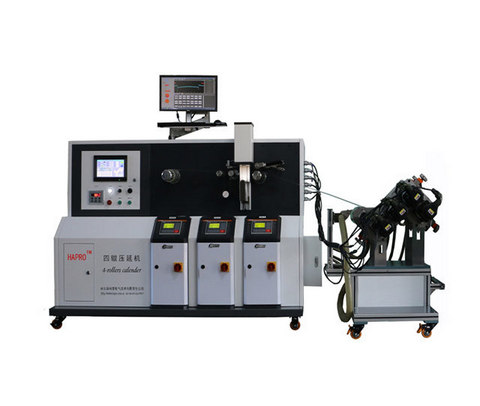 實驗室壓延機由壓延機和牽引卷取機組成。壓延輥數量可分為兩輥、三輥、四輥、五輥,壓延輥的排列形式可分為I形、L形、S形,壓延輥採用油加熱方式,加熱速度快,控溫精度高,壓延輥控溫油路可在串聯、並聯和混聯的不同聯接方式間快速更改,通過驅動間隙指示器直接調節壓延輥間隙,每個壓延輥的獨立伺服驅動,可實現相鄰兩輥間轉速差的無級調節,根據需要可實現任意壓延輥壓延扭矩的測量。也可配備視覺系統,實現原料分散性檢測以及凝膠點、魚眼、黑點等薄膜品質缺陷檢測等拓展功能。