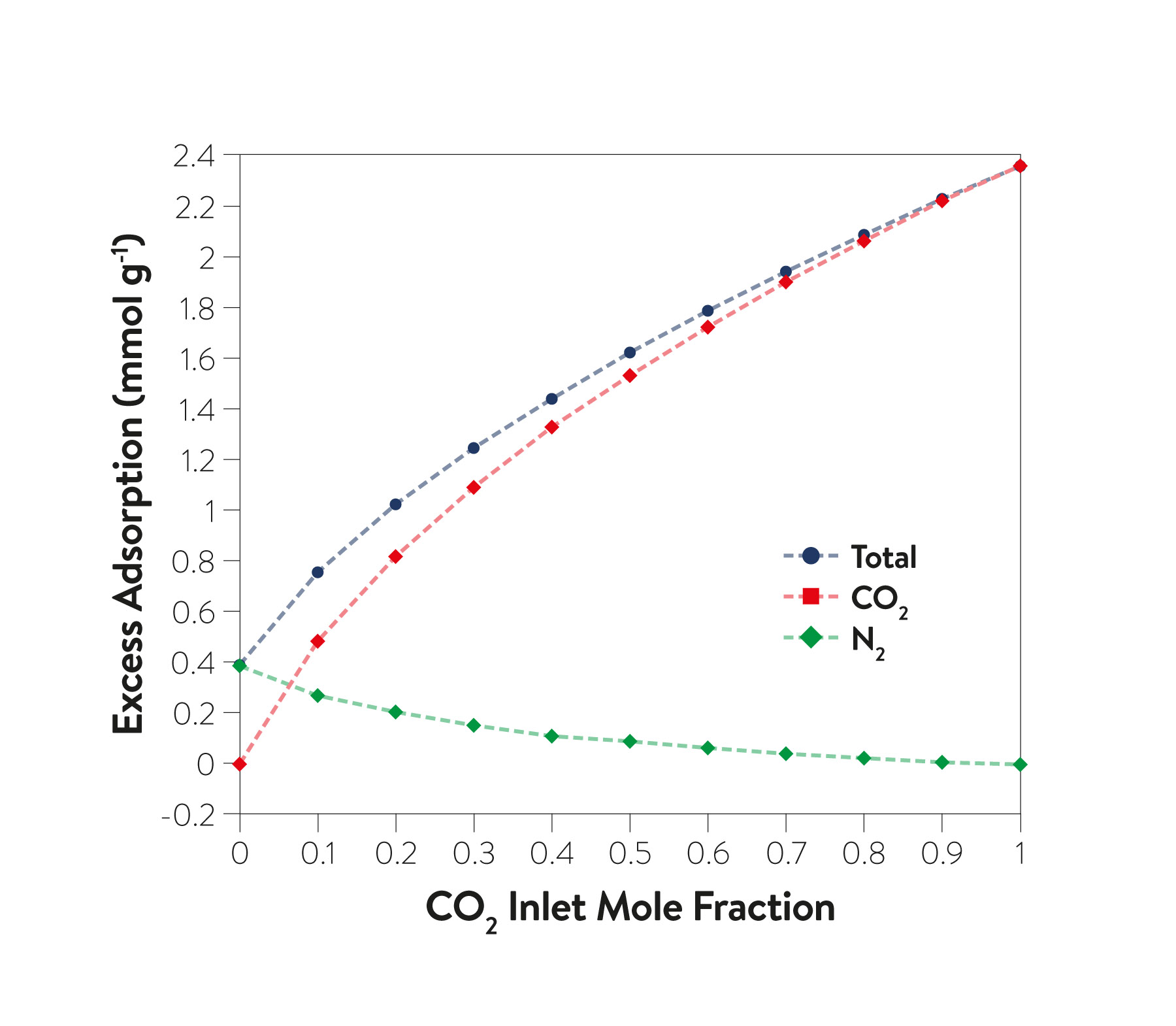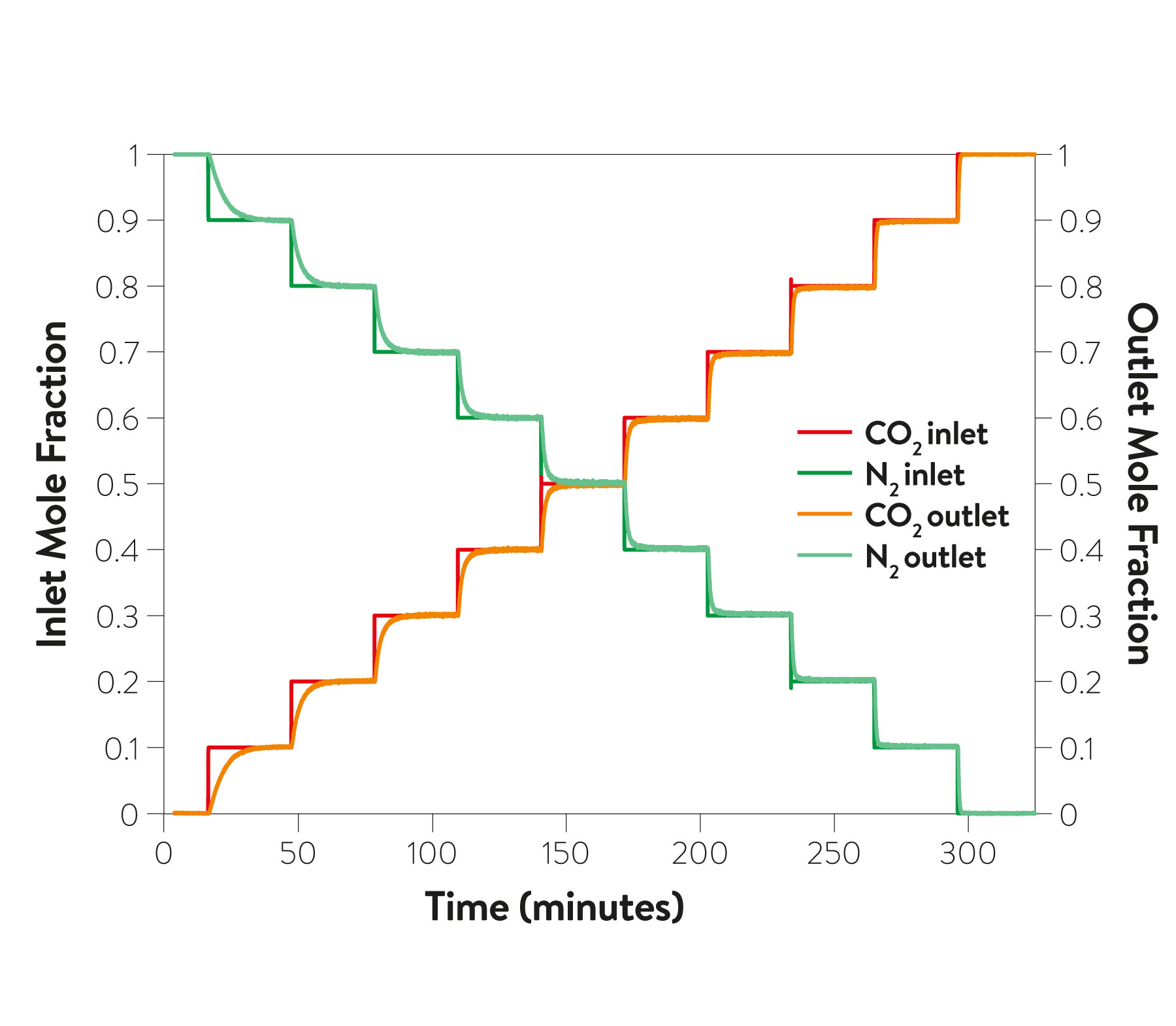 使用IMB方法測量的二元氮氣和二氧化碳吸附等溫線的動力學資料,顯示了每種成分的入口和出口摩爾分數。