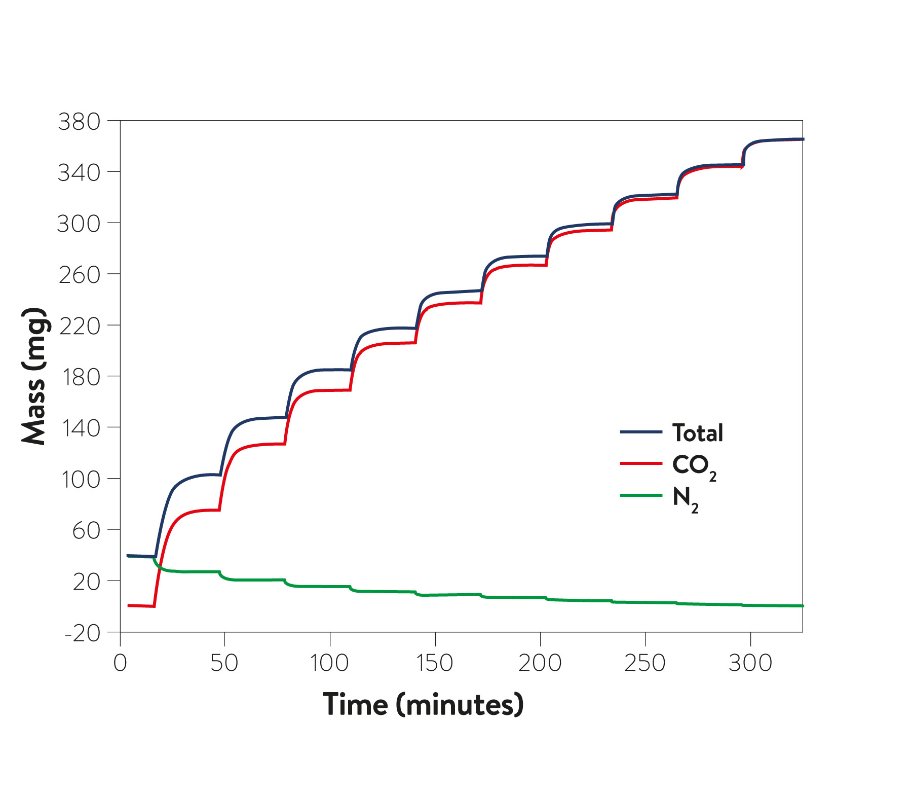 為二元氮氣和二氧化碳吸附等溫線測量的動力學資料,顯示總的吸附品質和每個成分的品質。