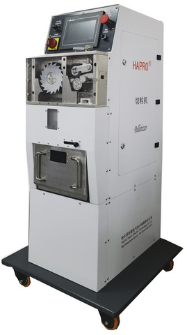 該機器將塑膠條狀物切割成顆粒狀物料,作為實驗研究用。