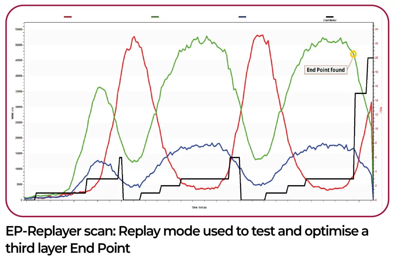 Hiden EP-Replayer 是 IMP-EPD 使用者的重要工具,可精準重播先前的蝕刻數據,用於微調與優化終點檢測配方。透過在演算法式配方模板中定義變數,使用者能即時重播記錄數據,並根據給定參數可視化預期的終點位置。