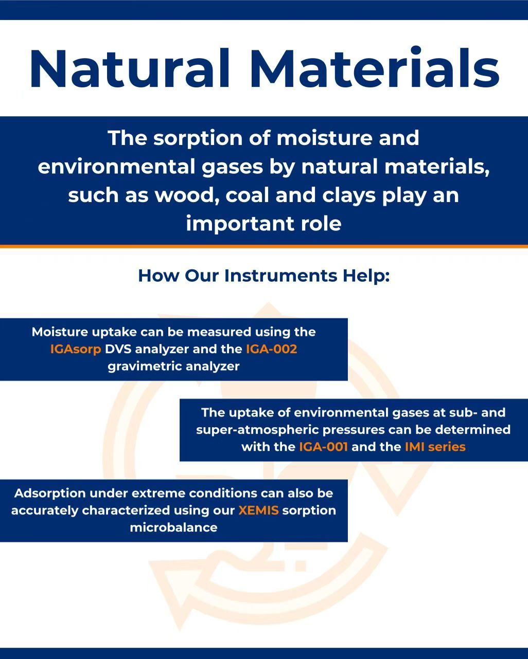 天然材料如木材、煤炭與黏土,會吸收水分與環境氣體,這些吸附行為在能源、環境與材料科學中扮演著重要角色。Hiden Isochema 提供完整的儀器解決方案,協助研究人員精確解析天然材料的吸附特性。