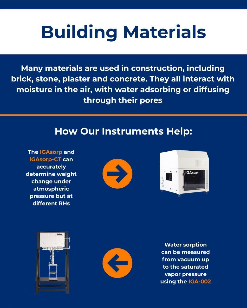 - IGAsorp 與 IGAsorp-CT:可在常壓條件下,於不同相對濕度 (RH) 精確測量建材的重量變化,模擬實際環境中的吸附行為。